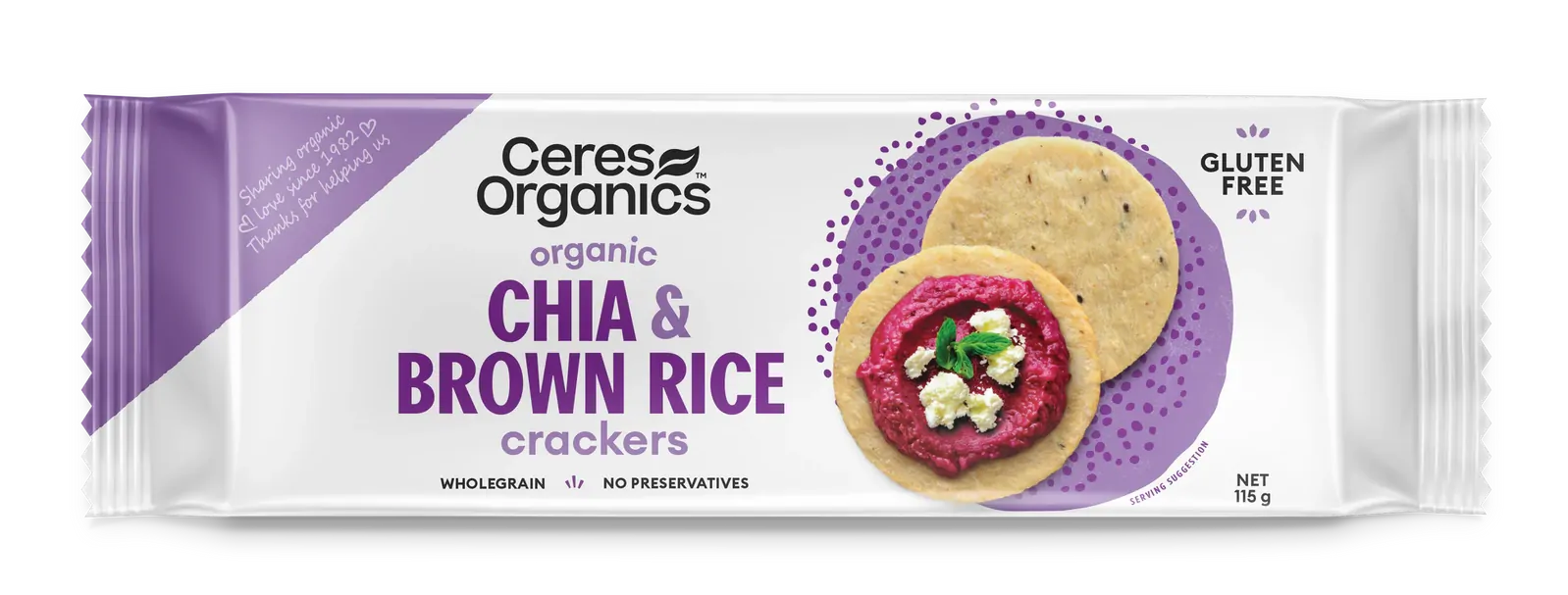| Inredients | Jasmine brown rice* 89%, sunflower oil*, chia* 5%, sea salt