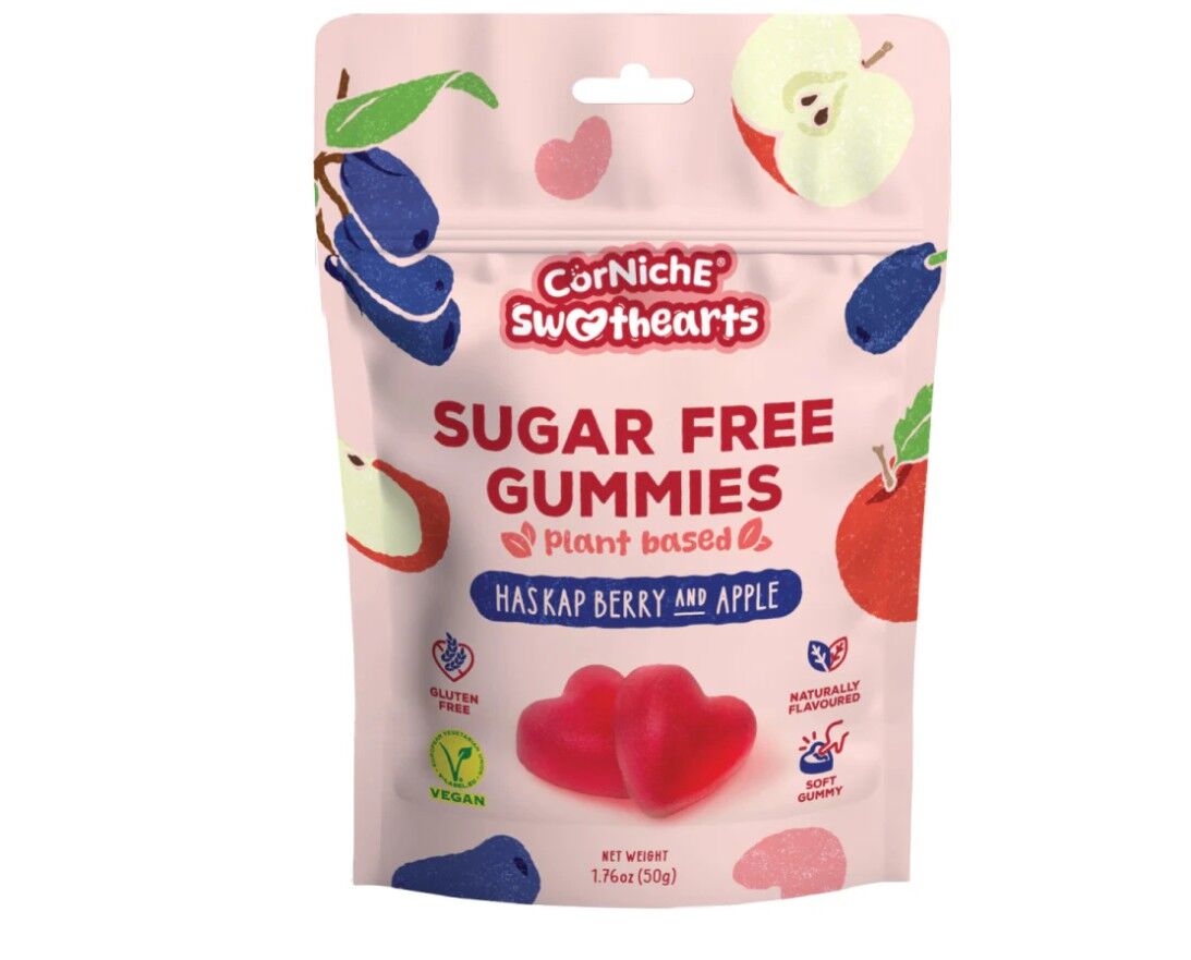Savour guilt-free indulgence with soft and juicy CorNichE Sweethearts Sugar Free Gummies! These plant-based and gluten free gummies combine the sweet, tangy taste of the functional superberries, Haskap Berry and Seaberry, paired with four delicious natural flavours. Providing a healthier and more affordable option to traditional gummies, Corniche Sweethearts are rich in vitamins and antioxidants. Experience a delight in every bite.