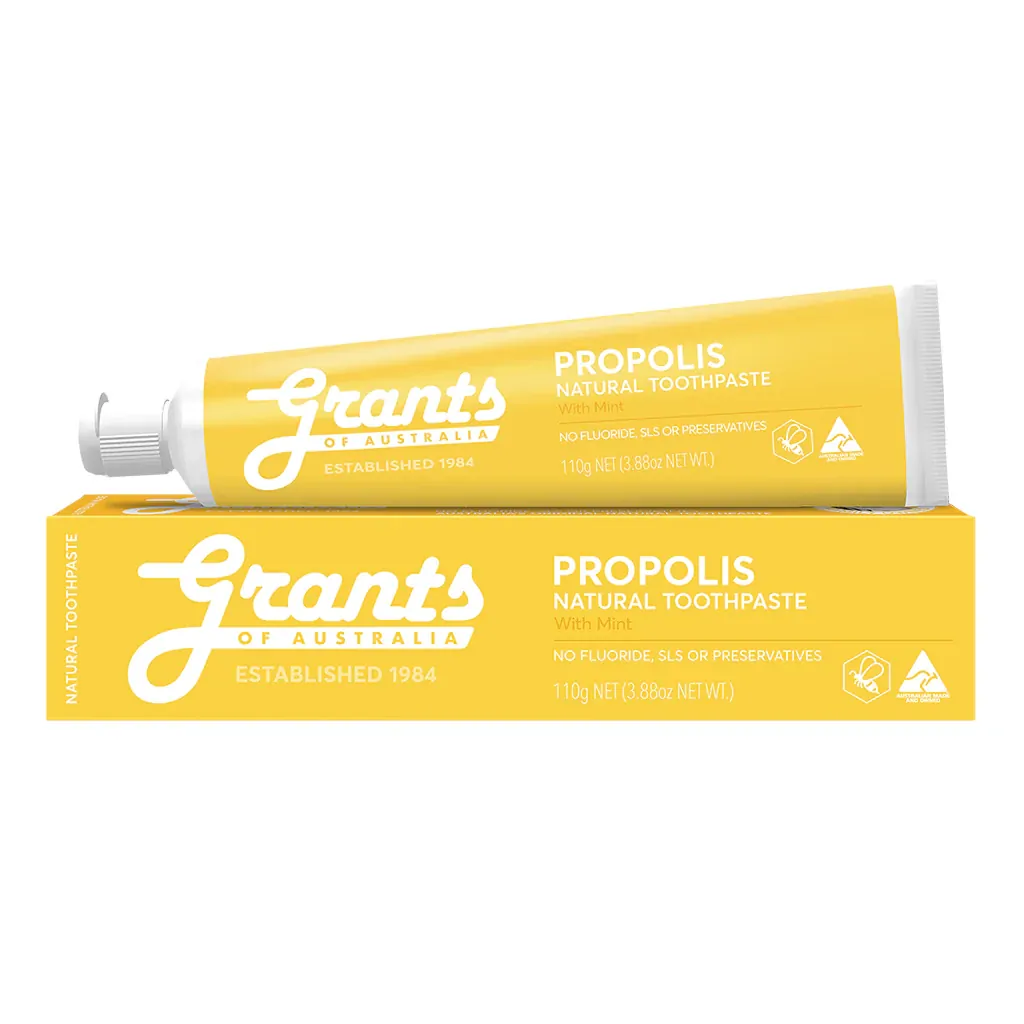 Grants Propolis Toothpaste delivers powerful natural protection for your teeth and gums. Formulated with propolis, an ingredient made by bees, known for its antibacterial and antiseptic properties, this toothpaste helps reduce plaque, fight inflammation and protect gums. It also minimises dental cavities and is perfect for people who want a strong minty taste. Bee-good to your smile – naturally!