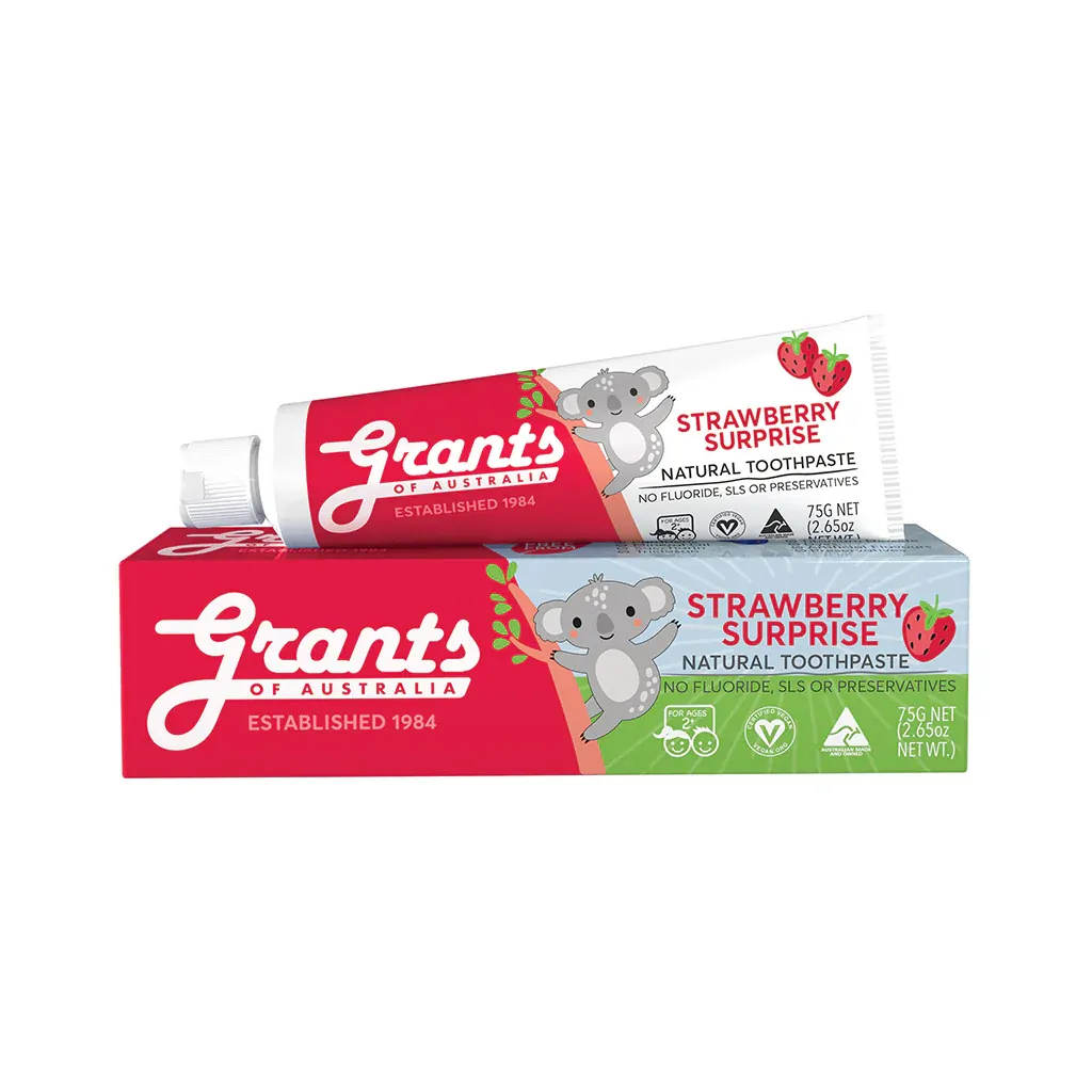 Kid tested and approved, Grants little taste testers have come back with the verdict: Grants Strawberry Surprise toothpaste is berry good and is jam packed with natural bacteria-fighting ingredients. Like xylitol, which is clinically proven to inhibit the growth of cavity-promoting bacteria and reduce plaque. Fluoride free and no added nasties like sugar, SLS and Parabens, so parents will love it too!