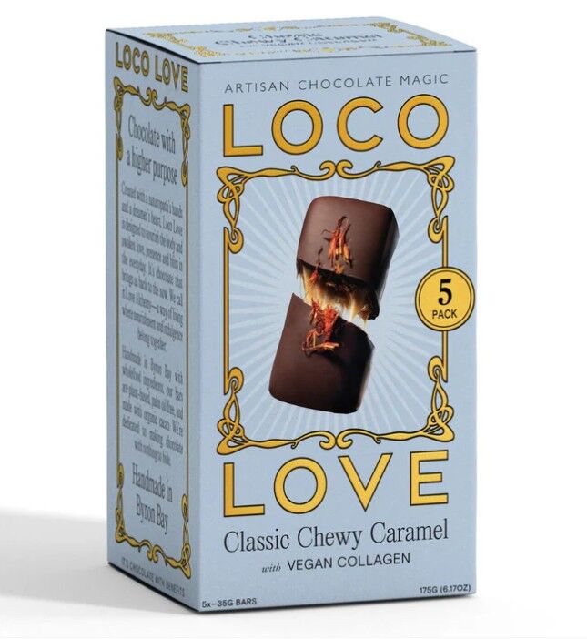 Inredients | Cacao paste*, coconut blossom sugar*, cacao butter*, brown rice syrup*, coconut milk*, plant-based collagen (2.8%) (broccoli juice extract, carrot juice extract), safflower petals, caramel extract (<1%) vanilla bean*, Australian sea salt, sunflower lecithin. [Cacao solids 48.5%] *Organic |