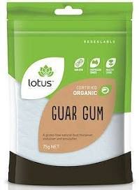 Lotus Certified Organic Guar Gum 75g. Lotus Organic Guar Gum is used to replace gluten in baking. Combine it with a gluten free flour when cooking breads, cakes, biscuits, and muffins to thicken, stabilise and emulsify.