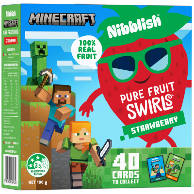 Nibblish x Minecraft Pure Fruit Swirls are here! Join us for the ultimate fruit fuelled quest with our new 100% fruit snacks collaboration. There are 40 Minecraft fact cards to find, so snack smart, and collect them all!