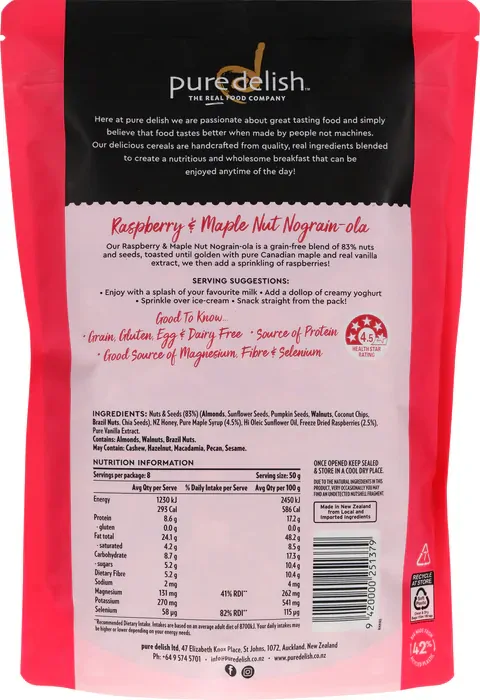 | Inredients | Nuts & Seeds (83%) (Almonds, Sunflower Seeds, Pumpkin Seeds, Walnuts, Coconut Chips, Brazil Nuts, Chia Seeds), Hi Oleic Sunflower Oil, Pure Maple Syrup (4.5%), NZ Honey, Freeze Dried Raspberries (2.5%), Pure Vanilla Extract. |