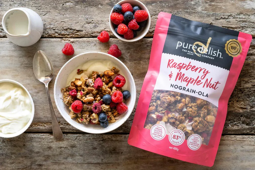 Raspberry & Maple Nut Nograin-ola is a grain-free blend of 83% nuts and seeds toasted until golden with pure Canadian maple and real vanilla extract, we then add a sprinkling of freeze-dried raspberries.
